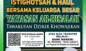 Jakarta – Hadirilah dan syiarkanlah Istighotsah Ihsaniyyah serta Haul Bersama Keluarga Besar Yayasan Ar-Risalah pada hari Sabtu (2/03/24) mulai pukul 18.00 – selesai WIB bertepatan di Kediaman Dr. KH. M. Chozin Machmud, MM. Jl. Komp. Polri RT 09/08 No. 14, Ciracas, Jakarta Timur.